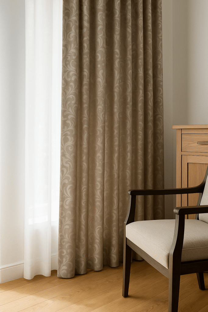 В тренде фактурные шторы: лён, хлопок, смесовые ткани с лёгкой неоднородностью, «живой» поверхностью. Они создают глубину и не требуют яркого принта, чтобы выглядеть интересно.