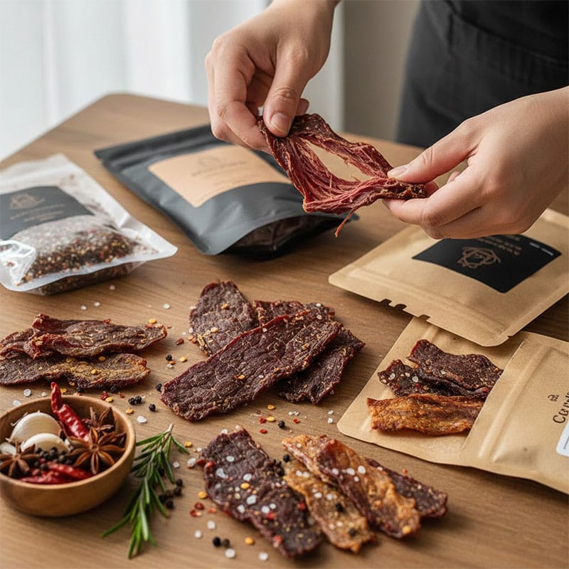 Современные джерки должны быть упакованы герметично — в вакуумные пакеты или пакеты с зип-локом. Это защищает продукт от влаги и окисления.