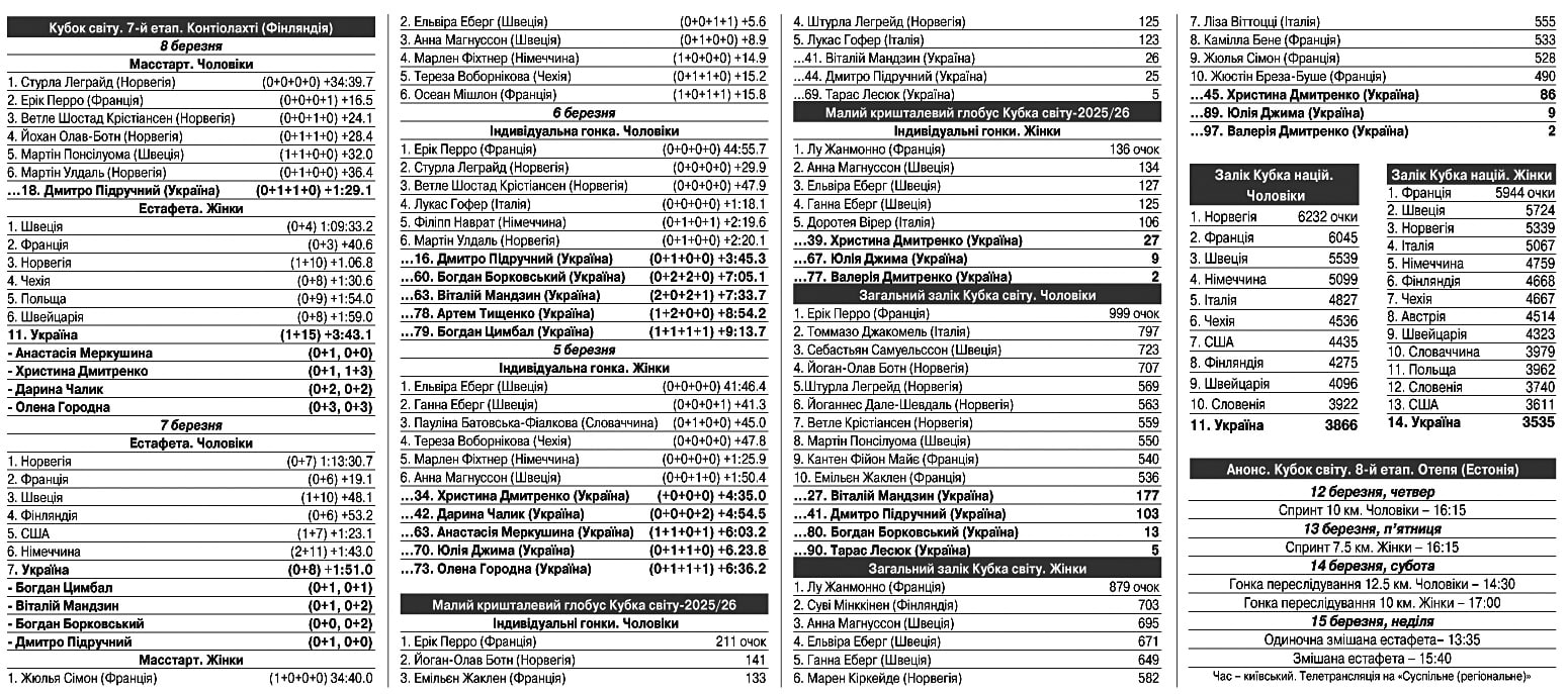 Після 7-го етапу в Контіолахті. На спортсменів чекатиме кількаденний перепочинок перед продовженням боротьби на передостанньому етапі сезону в естонському Отепя, який відбудеться з 12-го до 15-го березня. Важливо, що із заліком до Кубка націй на цьому етапі буде проведено низку гонок: чоловічий і жіночий спринт, одиночна змішана естафета та змішана естафета. А також до особистого заліку – гонка переслідування.